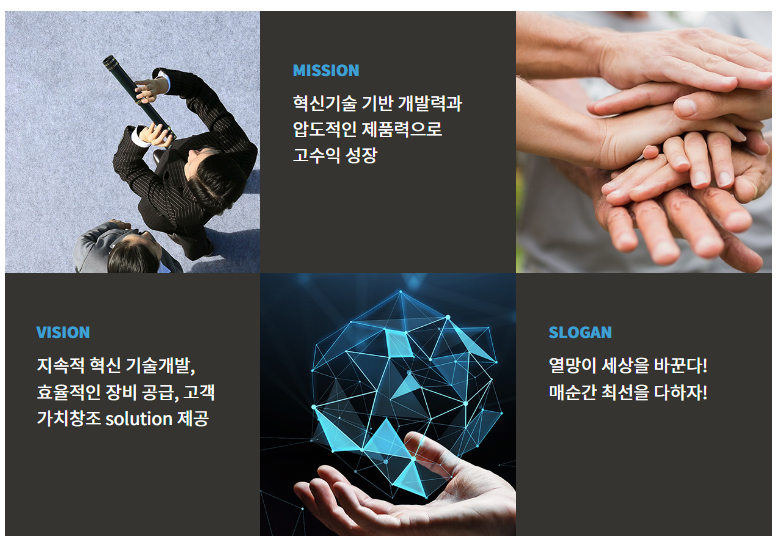 | ㆍ사업종류 : 특수목적용 기계 제조 ㆍ설립일자 : 2016.09.05 ㆍ상장일자 : 2018.04.04 ㆍ기업형태 : 중소기업, 코스닥상장 ㆍ소 재 지 : 경기도 안양시 동안구 시민대로327번길 12-26 ㆍ매 출 액 : 1,009억 3,122만 (2023.12.IFRS 연결) |